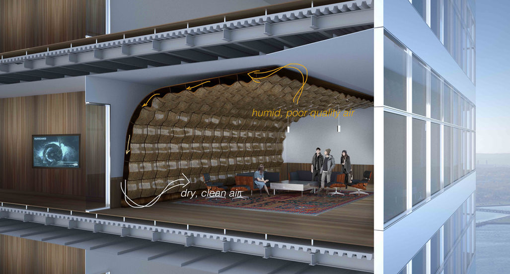 Agricultural By-product Modular Building-Integrated Systems (AMBIS) use locally available materials to provide positive indoor environmental conditions through localized remediation of moisture and pollutant loads in the air. Using the high sorption capacity of coconut and hydrogel, building-integrated panels draw moisture from the air to create a noticeable change in humidity, which in turn reduces the energy needed to heat or cool the space. Modular efficiently produced wall panels are formally designed to direct air flow and provide acoustic performance, all while reducing burdens on waste systems.